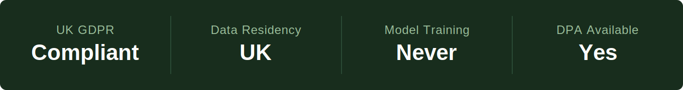 Primary Data Location. Customer data is stored and processed in the UK. This is a stronger position than EU-only storage and is directly relevant for practices operating under UK GDPR.