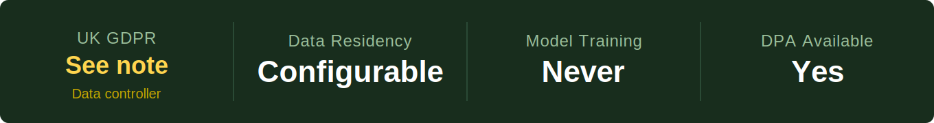 Data residency is configurable but no default is stated. Confirm which region your data will be stored in and ensure it meets your governance requirements, particularly if you hold NHS contracts or similar.